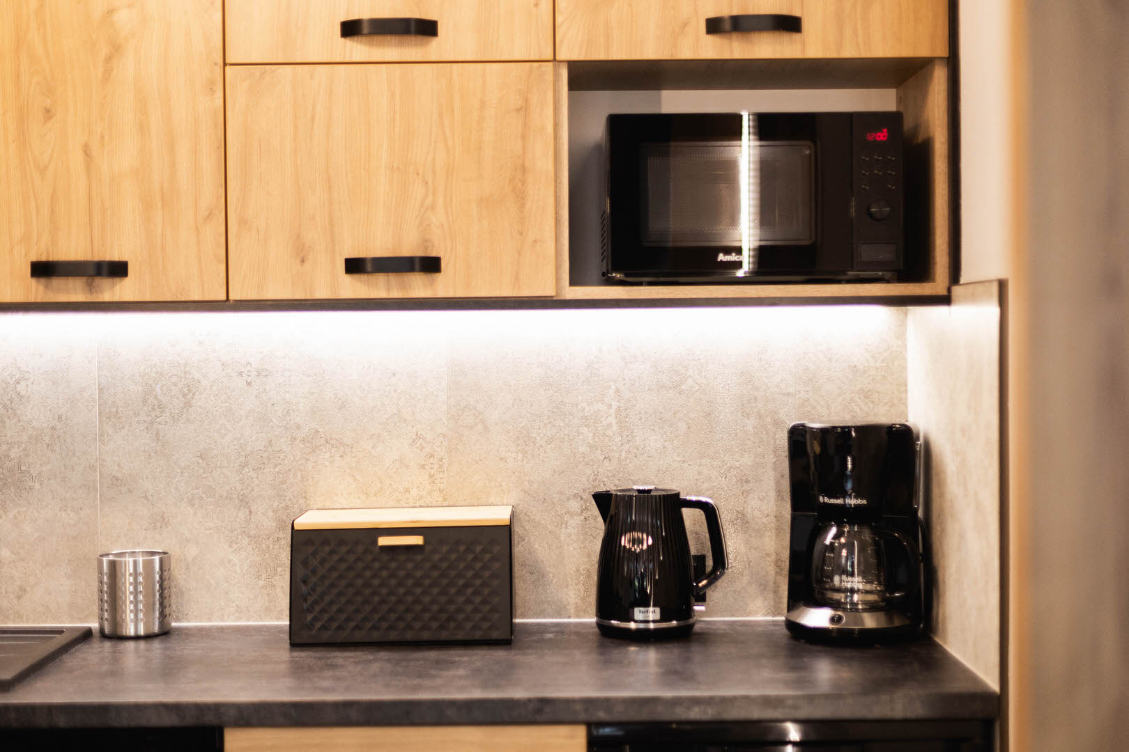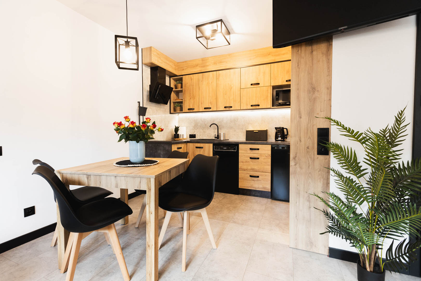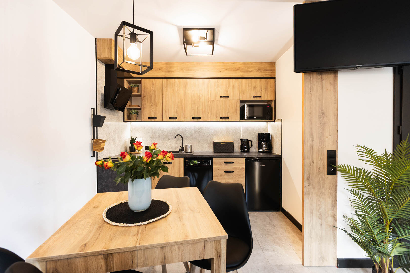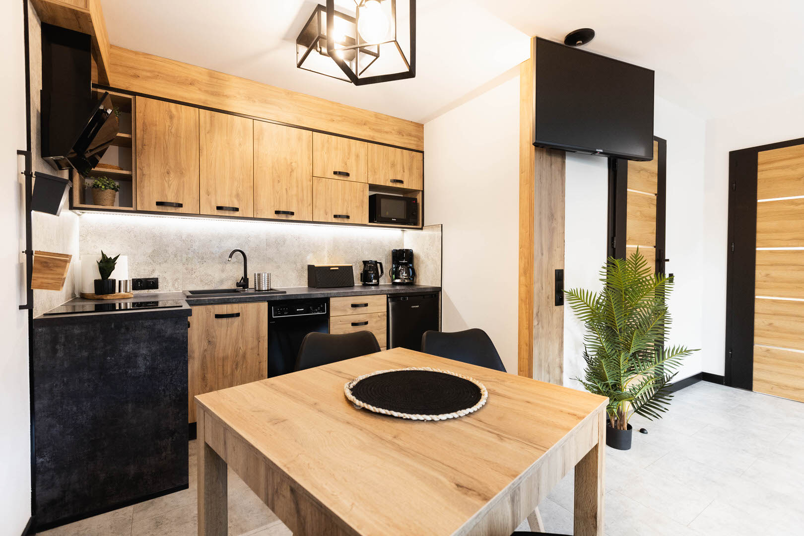 Nasz kuchnia wyposażona w nowoczesne urządzenia i wysokiej jakości sprzęty, sprawi, że przygotowywanie posiłków stanie się prawdziwą przyjemnością. W kuchni znajdziesz wszystko, czego potrzebujesz, by stworzyć smaczne dania - od kuchenki mikrofalowej po piekarnik, od ekspresu do kawy po garnki i patelnie. Przestronna lodówka i duży blat roboczy zapewniają wygodę i komfort podczas przygotowywania potraw. To idealne miejsce, by eksperymentować z lokalnymi smakami lub przyrządzać ulubione dania dla rodziny i przyjaciół.